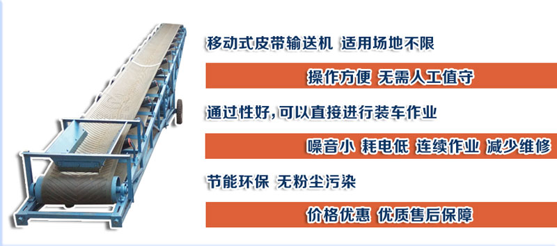 移動(dòng)皮帶輸送機(jī)適用于散狀物料或成件物品的短途運(yùn)輸和裝卸工作。轉(zhuǎn)動(dòng)裝置為電動(dòng)滾筒,并配有充氣輪胎和鋼輪兩種行走輪。機(jī)長(zhǎng)10米以上傾角可調(diào)。
