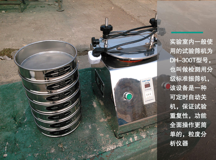 實(shí)驗(yàn)室內(nèi)一般使用的試驗(yàn)篩機(jī)為DH-300T型號(hào),也叫做檢測用分級(jí)標(biāo)準(zhǔn)振篩機(jī),該設(shè)備是一種可定時(shí)自動(dòng)關(guān)機(jī),保證試驗(yàn)重復(fù)性,功能全面操作更簡單的,粒度分析儀器。可將一種顆粒料同時(shí)精密分出2~8個(gè)粒子段。可用于漿液料的細(xì)度及雜物含量分析,噪音小,重量輕;平臺(tái)操作,無須固定。調(diào)節(jié)振動(dòng)快,可調(diào)節(jié)振幅。